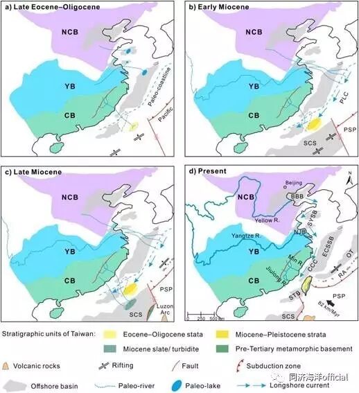 在几千万年以前,那时的台湾岛还是大片的松散沉积物,静静地躺在东亚陆架之上。也就最近几个百万年的时间,得益于菲律宾板块与欧亚大陆的“对抗”,这些沉积物才终于结束了暗无天日的海底生活,快速抬升几千米而成岛。那么,这些作为宝岛“骨架”的沉积物,最早都是从哪儿来的呢?又是如何搬运至现今的位置?要想解决这两个充满哲学意味的问题,得从新生代东亚地区的河流系统演化、古地理格局变迁以及陆架沉积环境转变等角度综合考虑。