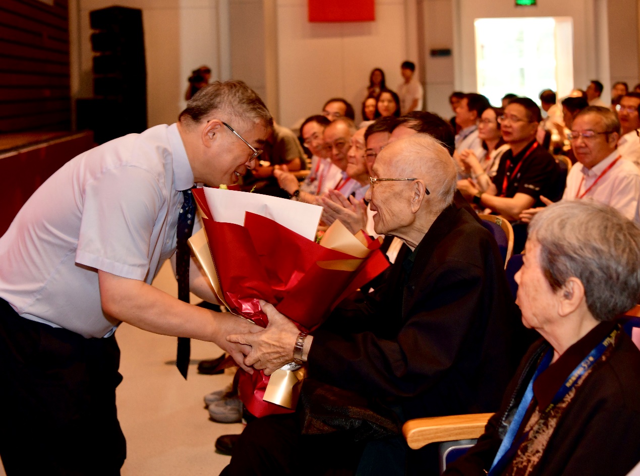 上午9时,庆祝大会在四平路校区一·二九礼堂举行。会上,翦知湣院长代表学院师生向年逾八旬仍心系学科发展、继续发光发热的退休老教师们献上鲜花,表达由衷的敬意和感谢。