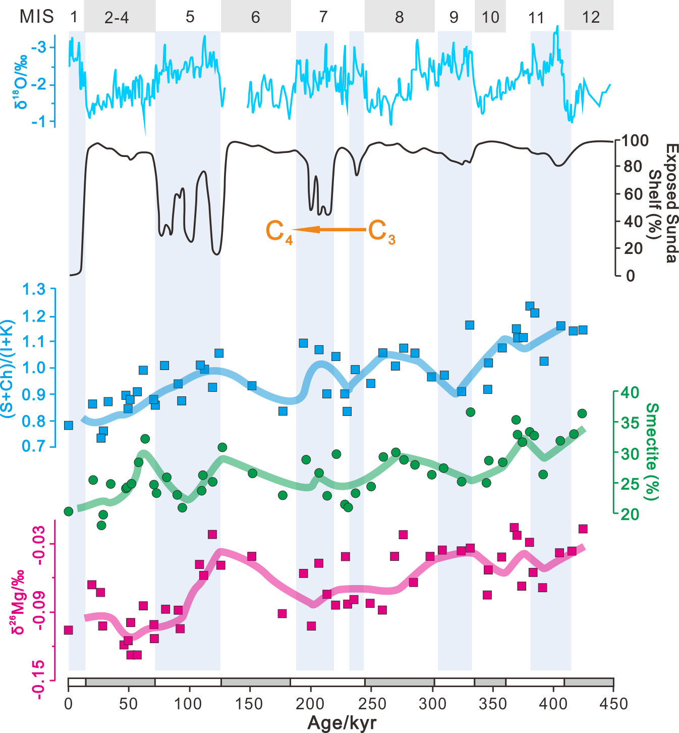 图1. 巽他大陆架相对暴露面积与MD05-2901 钻孔有孔虫氧同位素、蒙脱石含量以及粘土粒级沉积物镁同位素变化的相关性。