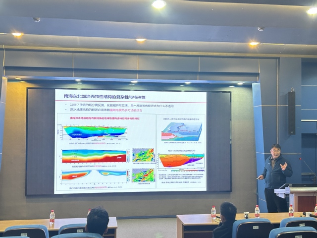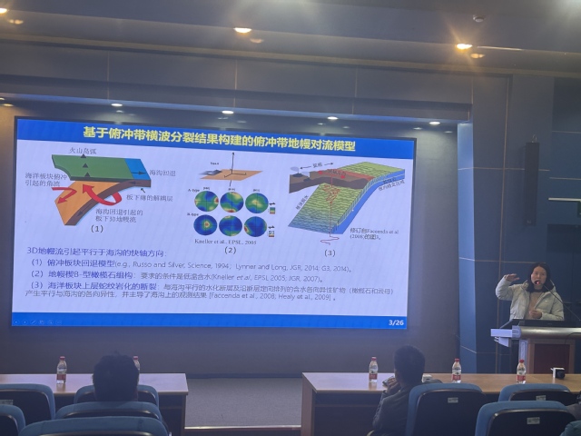 马波研究员围绕“沿海沟走向的剥蚀强度变化:基于地震波速成像的探讨”这一主题,展示了最新研究成果。通过对高分辨率主动源探测数据的精细处理与解析,研究发现海沟侵蚀速率存在显著的空间差异性,并通过速度结构模型验证了这一现象。研究还探讨了观测结果与智利地区地震活动的潜在关联,为理解海沟动力学过程与地震孕育机制提供了新的观测依据。
