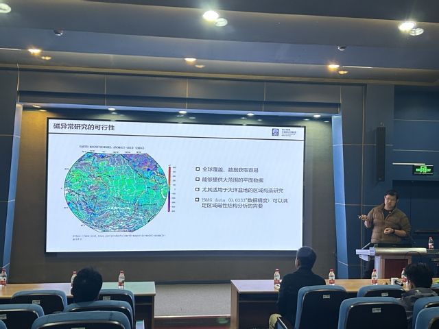 赵崇进助理教授分享了“基于三维斜磁化反演的菲律宾海盆西侧深部结构研究”的最新进展。研究团队在西菲律宾海盆开展了系统的三维地磁探测,通过整合奇异谱分析与归一化源强度等先进数据处理方法,实现了区域磁异常信号的高精度提取。结合三维倾斜磁化反演技术,研究清晰地揭示了该区域的磁性结构特征,确认加瓜海脊的火山弧属性,限定了白垩纪洋壳的分布范围,阐明了加瓜海脊东南部浅部退磁区的形成机制,并建立了相应的构造演化模型,为理解西太平洋板块俯冲动力学提供了新的深部约束。
