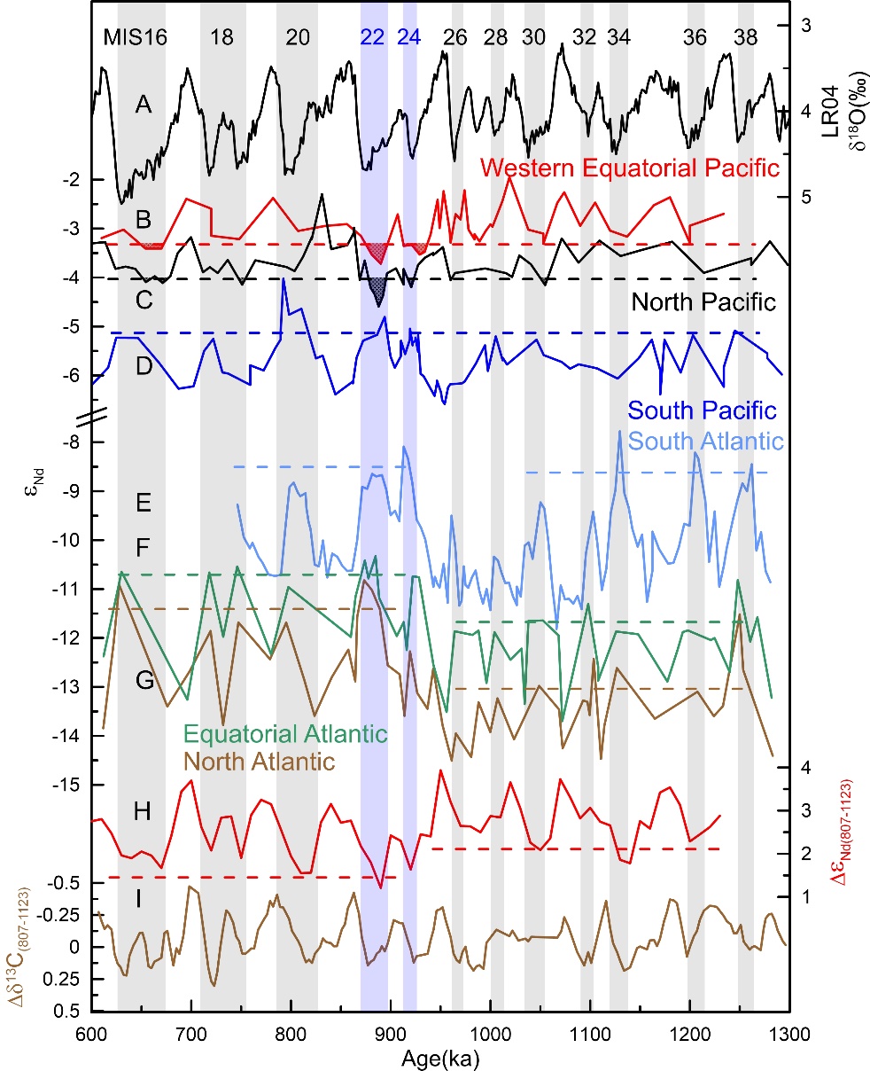图1. MPT期间全球洋流记录。(A)LR04底栖有孔虫氧同位素记录。(B) ODP Site 807 εNd(本研究)。(C) ODP Site 1208 εNd(本研究)。(D) ODP Site 1123 εNd(本研究)。(E) IODP Site U1479 εNd。(F) DSDP Site 926 εNd。(G) ODP Site 607 εNd。(H) ODP 807与1123站位之间εNd差值。(I) ODP 807与1123站位之间δ13C差值。虚线示冰期平均值。