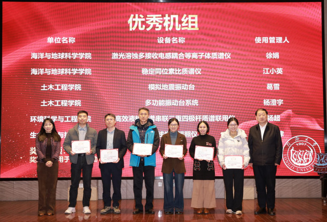 2025年12月17日,同济大学大型仪器设备开放共享交流会在沪西校区召开,学校对2024年度大型仪器设备使用效益评价考核优秀单位和机组进行了表彰,海洋与地球科学学院/海洋地质全国重点实验室在本次考核中脱颖而出,以全校第一的优异成绩获评优秀单位;同位素化学分析室“激光溶蚀多接收电感耦合等离子体质谱仪”、稳定同位素比值质谱分析室“稳定同位素比质谱仪”,更是包揽全校优秀机组前两名,展现了学院和重点实验室在大型仪器管理与运行方面的卓越实力。