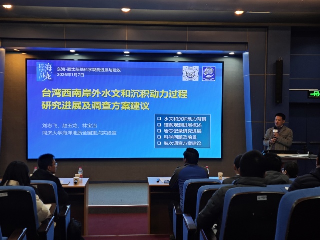 同济大学海洋地质全重室主任刘志飞教授系统介绍了同济大学在台湾西南岸外水文和沉积动力过程研究方面的成果和进展;针对台湾西南海域的构造、水文及沉积动力背景,并结合前人在该海域多时间尺度浊流沉积的观测结果,他从水文观测、柱状样采集、延时水深多波束地形测量和锚系观测等多方面,对后续航次调查提出宝贵建议。