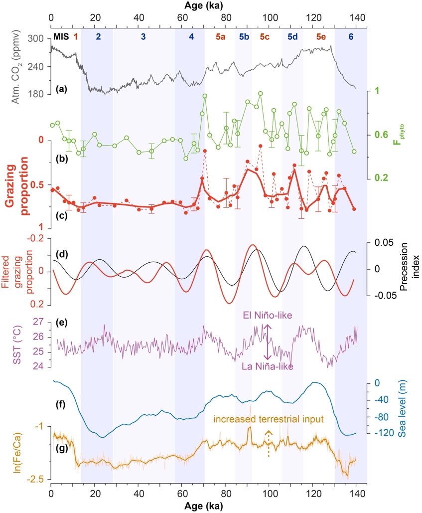 该研究通过分析赤道西太平洋沉积岩芯中的氨基酸氮同位素记录,首次重建了该区域过去十四万年以来群落营养结构的变化历史。基于营养型与源氨基酸之间的氮同位素梯度,结合理想化的生态模型,该研究定量估算了有机碳平均营养级和被摄食比例(即初级生产者被消费者摄食的比例)变化。结果表明有机碳的平均营养级、被摄食比例均呈现显著的岁差周期变化特征:在岁差高值时期,平均营养级和摄食比例较低,主要归因于赤道西太平洋处于类厄尔尼诺平均态,次表层营养盐向表层的供给增加(图1)。此外,间冰期时的平均摄食比例略低于末次冰期,暗示海平面变化可能也发挥相应作用。这些发现揭示了受轨道驱动的赤道西太平洋上层水体结构变化,可以调控生态系统营养结构。
