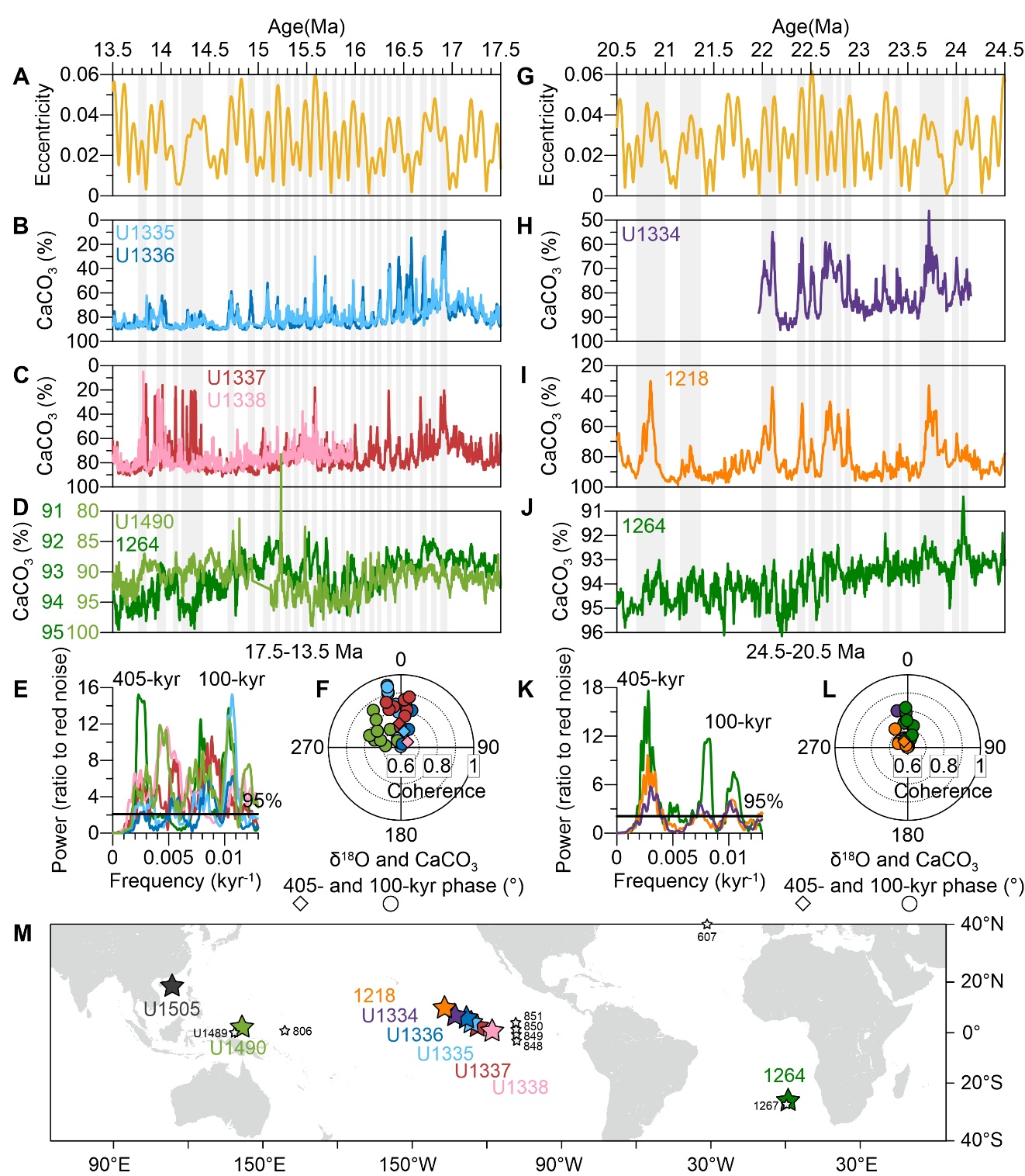 图3. 深海CaCO3沉积记录表现出显著的偏心率周期,与同站位的δ18O和δ13C呈现同相位变化。(A和G)偏心率。(B至D, H至J)太平洋站位(1218、U1334、U1335、U1336、U1337、U1338、U1490)和大西洋站位(1264)的CaCO3记录。(E和K)CaCO3记录的谱功率。(F和L)在40万年和10万年周期上,δ18O与CaCO3记录之间的交叉谱相干性和相位角。(M)相关站位位置。