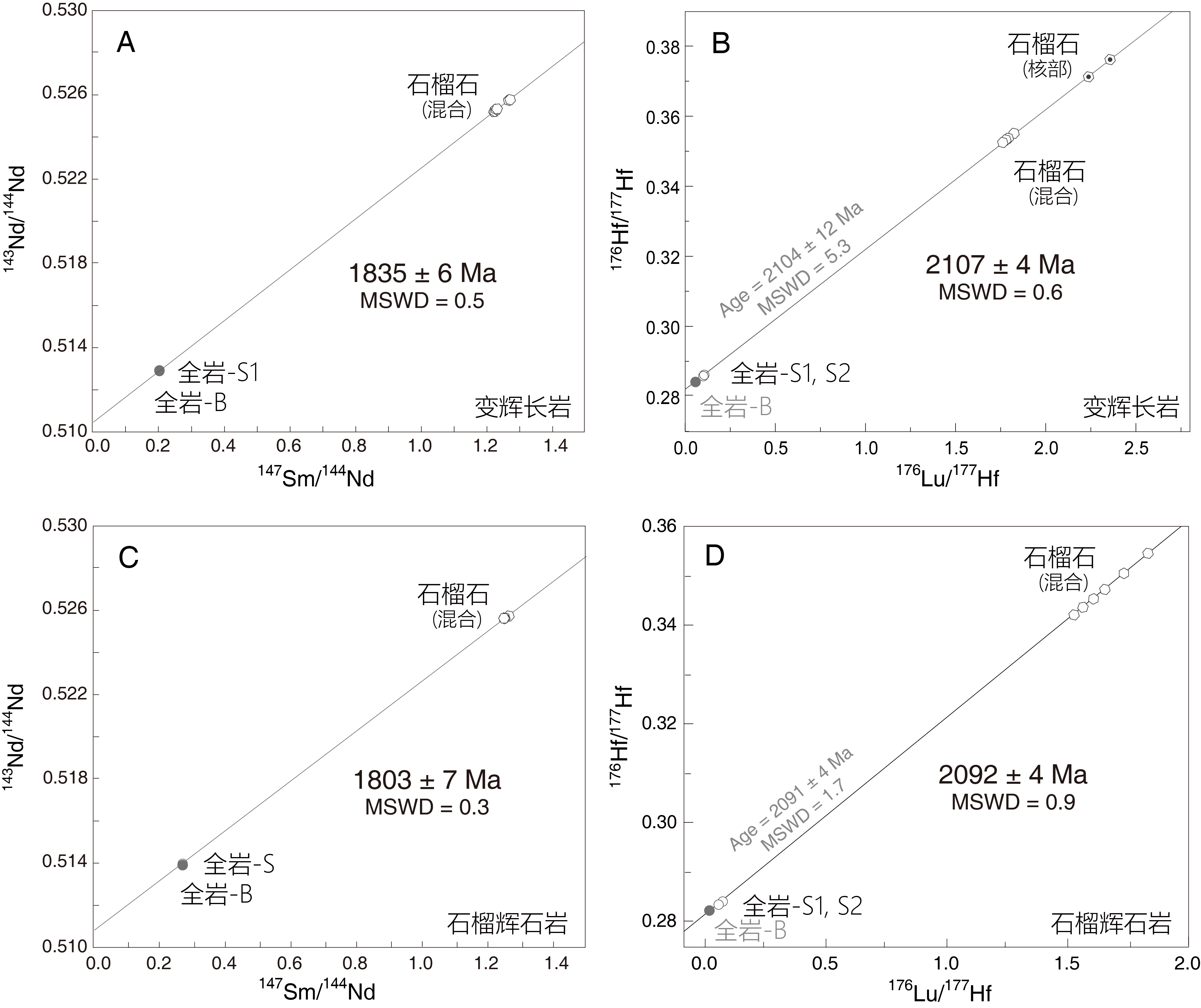 图1 变辉长岩及其包裹的石榴辉石岩的石榴石Lu-Hf与Sm-Nd等时线图。