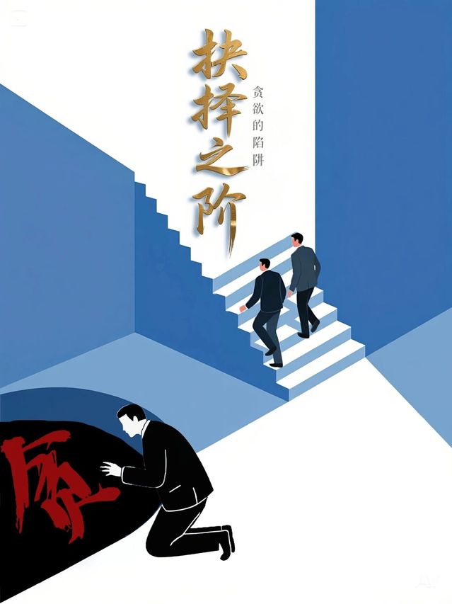 设计思路:海报以蓝天为背景,白色阶梯象征人生发展之路。图中人物形成鲜明对比:两人昂首向上,背对贪字,代表坚守正道;另一人跪地触碰红色贪字,展现贪欲的卑微。“贪”所处的黑洞暗示贪婪的深渊。作品通过简洁构图和强烈色彩对比,警示人们面对贪欲时要保持清醒,做出正确抉择。红色贪字如警钟,提醒贪婪的危险性,强调一念之差可能导致截然不同的人生结局。