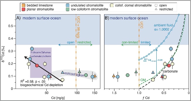 Cd同位素组成特征表明,在开放盆地条件下微生物栖息地存在较高的初级光合生产力,其重同位素组成已达到现代表层海洋水平。相反,在限制性条件下,叠层石Cd同位素组成偏轻,且Cd浓度较高,表明当时Cd的可利用性不受限。