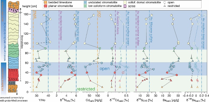 为寻求以上问题的合理解释,该研究选取奥地利上普伦多夫盆地Rabenkopf剖面的Ritzing组叠层石为研究对象,采用Ba-Cd同位素体系,并结合已发表的碳(C)、氮(N)、硫(S)同位素及微量元素数据,推算新近纪极端环境下盆地连通性与微生物群落营养盐可利用性的关系,进而探究盆地不同连通条件下(开放/局限)微生物群落代谢方式的转化。