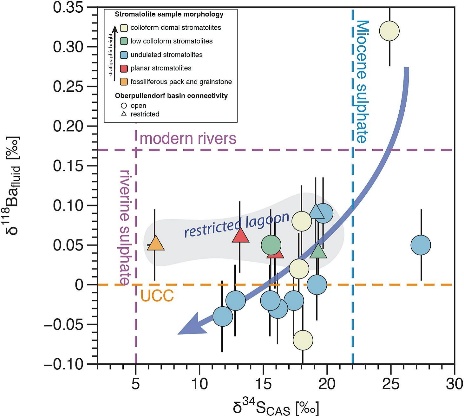 图2. Ritzing组叠层石碳酸盐相Ba同位素组成与S同位素组成协变关系