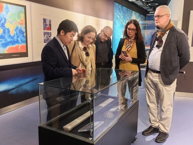 会谈结束后,代表团一行来到位于海洋楼一楼的深海科学馆参观。拓守廷结合馆内丰富的展陈内容,详细介绍了同济海洋学科在“深钻、深潜、深网”方面的进展。馆内不仅陈列着从南海科考中带回的冷水珊瑚等珍贵深海生物标本,还展出了海底科学观测网的关键设施模型以及我国参加大洋钻探计划的发展历程,直观呈现了同济海洋人在三深领域的探索足迹。代表团成员对馆藏展品与科普形式表现出浓厚兴趣,不时驻足交流。