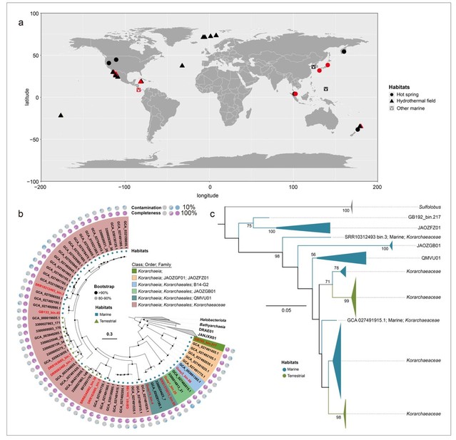 Abstract: Korarchaeota, an ancient lineage of archaea, has long been overlooked in discussions of archaeal and eukaryotic evolution. Their physiology and evolutionary history have remained enigmatic due to their rarity in natural environments. Here, we assembled 101 Korarchaeota genomes from different seafloor hydrothermal vents and terrestrial hot springs, revealing that Korarchaeota lineages have undergone multiple transitions between marine and terrestrial habitats. These transitions were accompanied by genomic shifts reflecting adaptations to habitat-specific physicochemical conditions, including variations in nutrient availability, potential energy sources, osmotic conditions, and viral predation stresses. Molecular dating suggests that Korarchaeota originated ~2.84 billion years (Ga) ago, with three subsequent diversification events occurring around 2.42, 1.52, and 1.29 Ga ago. These major diversifications coincide with key geological events such as the Great Oxidation Event and the breakup and formation of supercontinents. Our findings provide insights into the evolutionary trajectory and ecological adaptations of Korarchaeota, thereby enhancing our understanding of microbial coevolution with Earth’s dynamic surface environments.