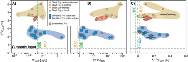 Abstract:Stromatolites record interactions of the biosphere, atmosphere, and hydrosphere. The evolution of C-fixation via diverse metabolisms is linked to metal availability for enzymes such as carbonic anhydrase. Stable Cd isotopes fractionation during uptake into carbonic anhydrase by modern phototrophs is readily recorded in authigenic carbonates. Here we test whether this proxy can be expanded to trace carbonic anhydrase in the microbial rock record. We analyzed Cd isotopic compositions in stromatolite occurrences of Western Australia, spanning from the Archean ( ~ 3.35 Ga Strelley Pool and ~2.72 Ga Tumbiana formations) to the Holocene Hamelin Pool. We record fractionated Cd isotopic compositions correlating with macro and micro-nutrients P, Cd and Zn, suggesting enzymatic metal-cycling in the Paleoarchean. Meanwhile, Rayleigh-type Cd isotope fractionation indicates its use as a co-factor in carbonic anhydrase from the Meso- to Neoarchean onwards. Our study offers new insights into the evolution of the metallome and its role facilitating early microbial metabolisms.